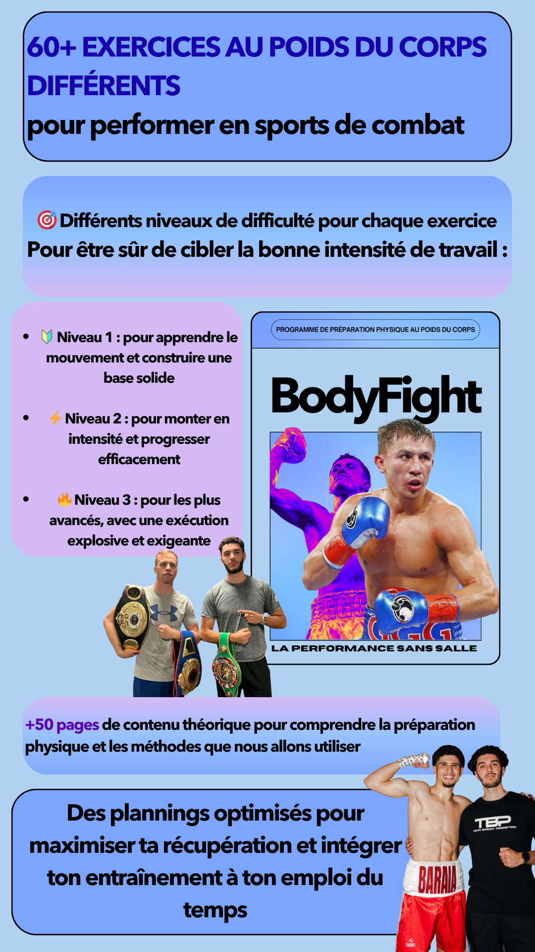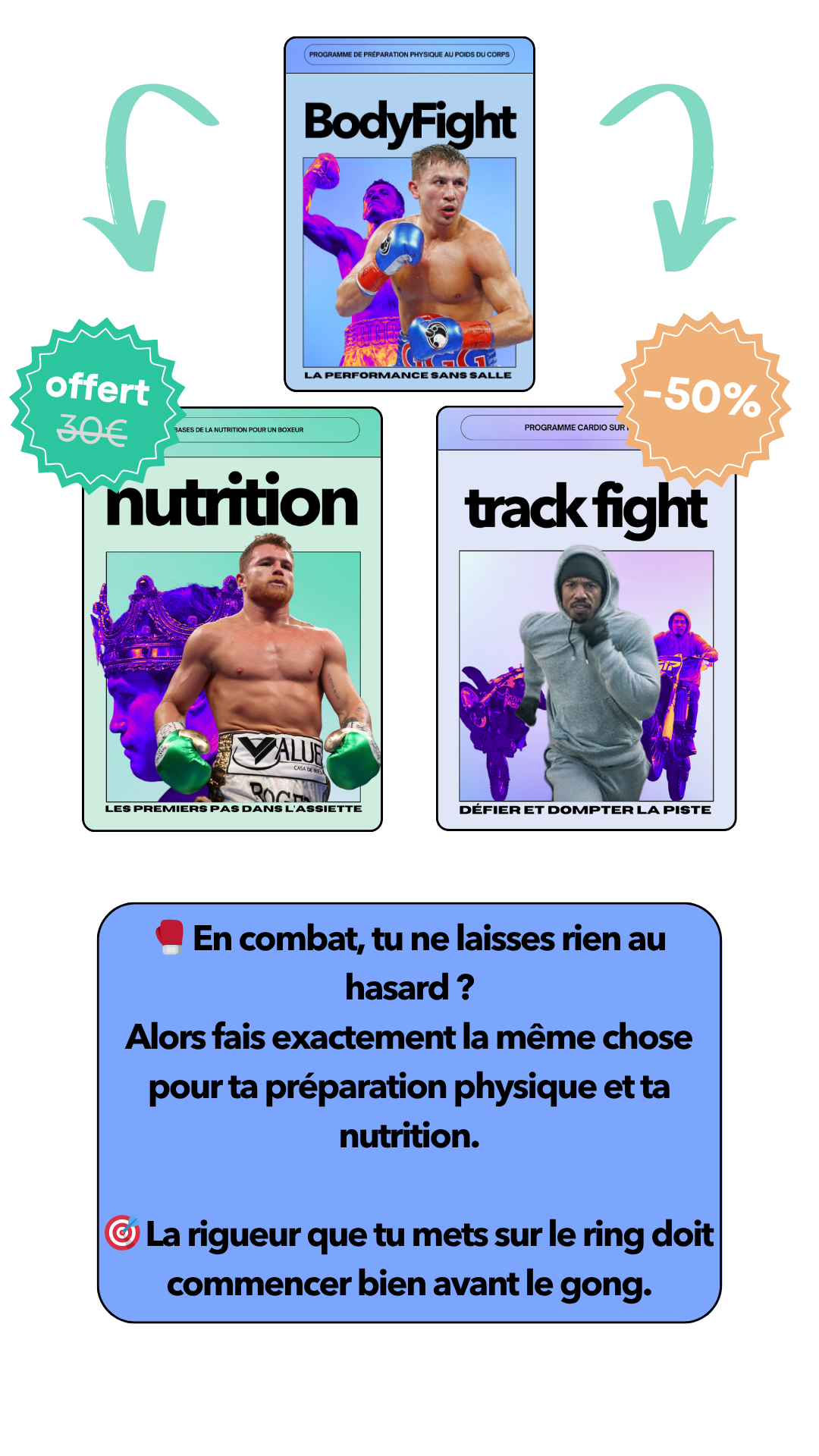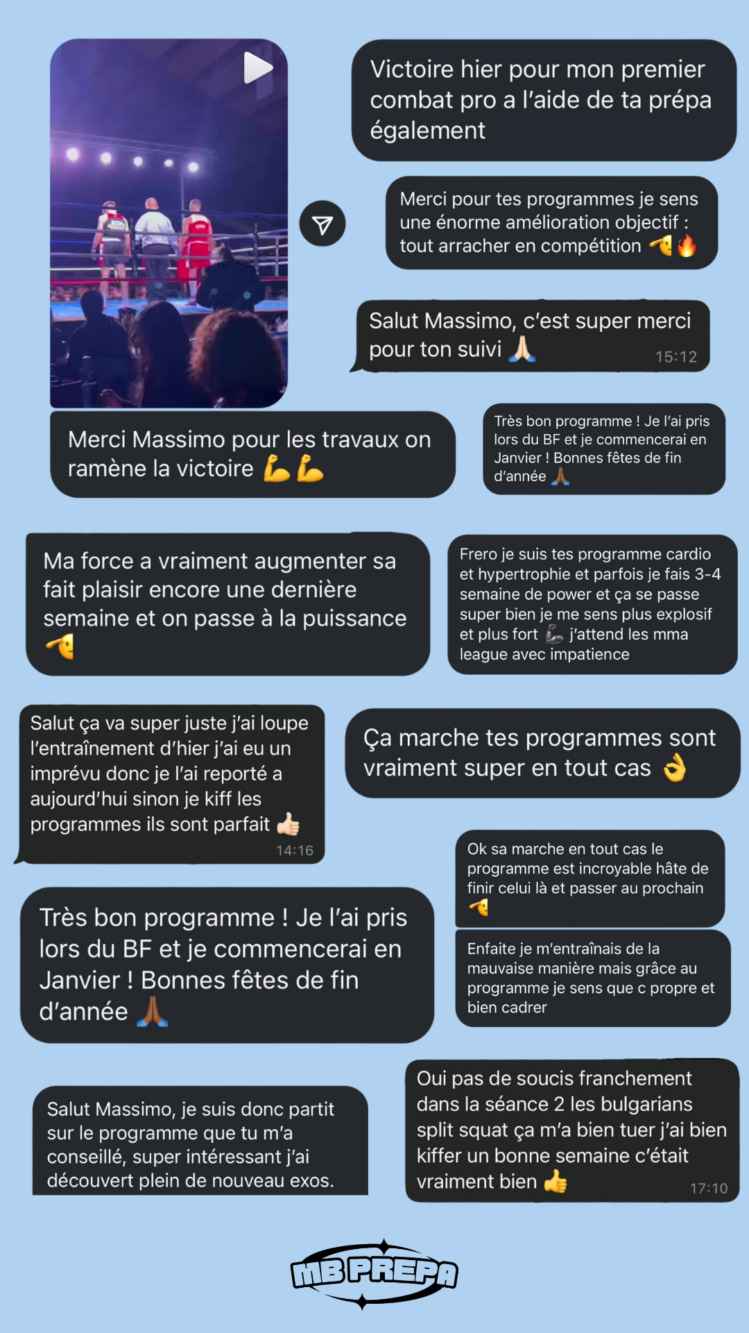 Je me permets de te proposer ce programme car maîtriser sa préparation physique est vraiment quelque chose d'indispensable pour la performance. Avec la méthode que je te propose je suis certain de t'aider à performer, certain de te donner les meilleurs armes pour combattre. À l'heure où j'écris ces lignes, j'ai eu la chance de travailler avec plus de 370 combattants différents, que ce soit à travers mes programmes en ligne ou par le biais d'un suivi en présentiel et personnalisé. J'ai pu faire mes preuves auprès de combattants de tous niveaux, de leur premier combat amateur à des combats en Asie pour remporter des ceintures continentales ou encore remporter le titre de champion de France en boxe anglaise et même signer la performance of the night à l'UFC Paris 2024.