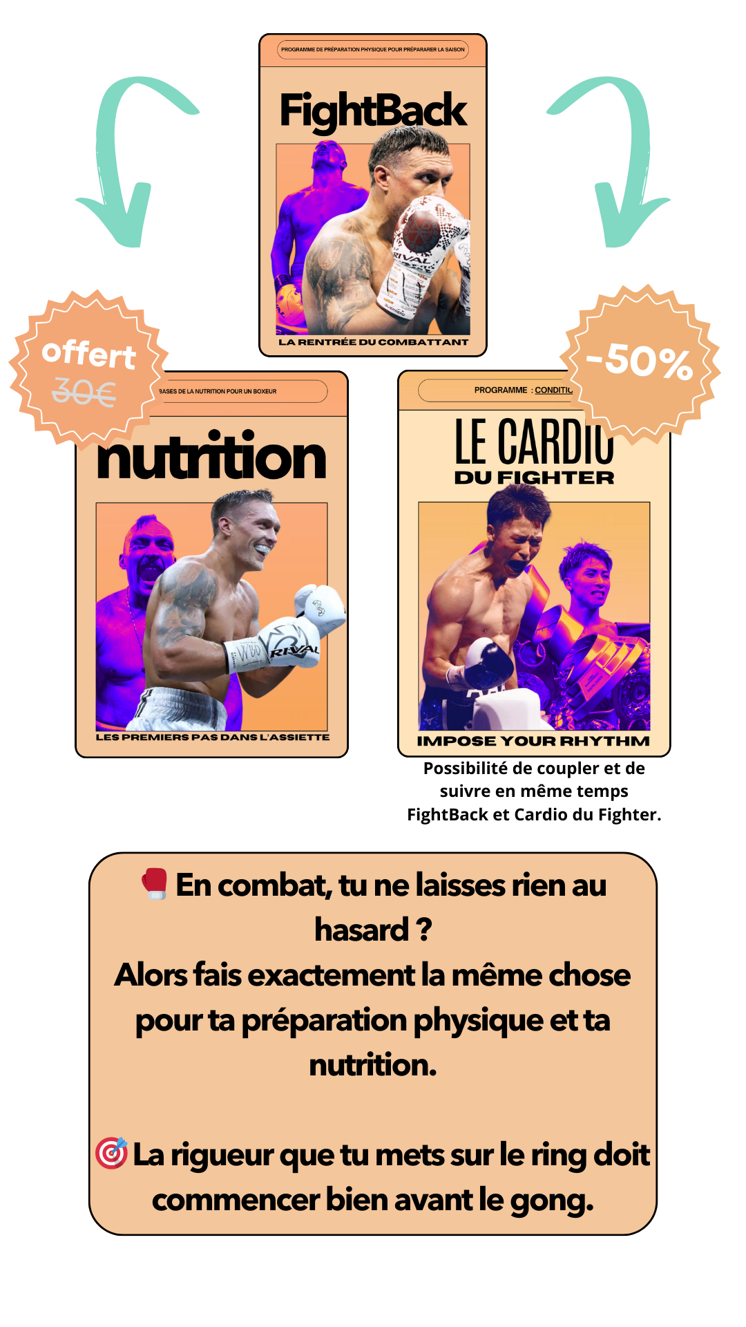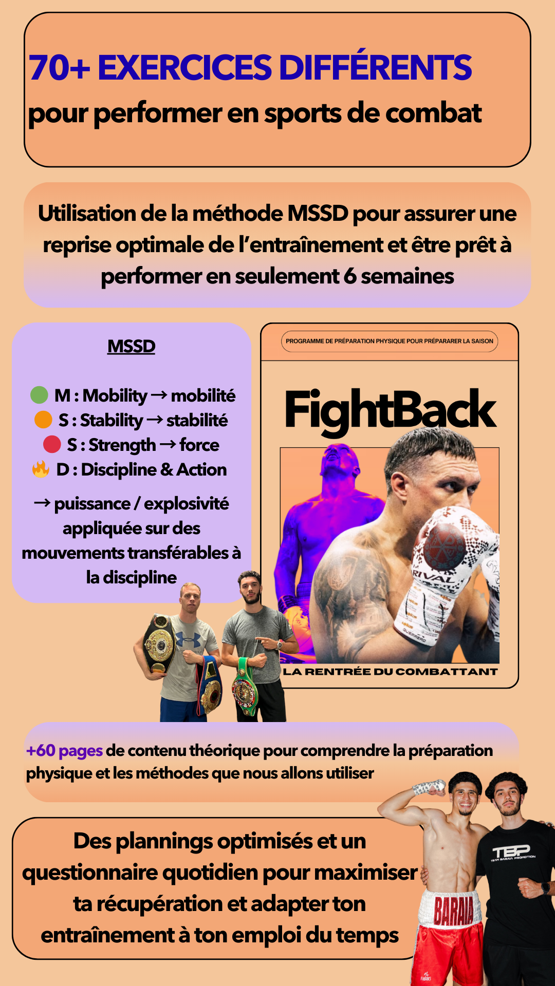 FIGHTBACK est le programme conçu spécifiquement pour les combattants qui veulent redémarrer fort, intelligemment, et poser les bases d’une saison réussie.