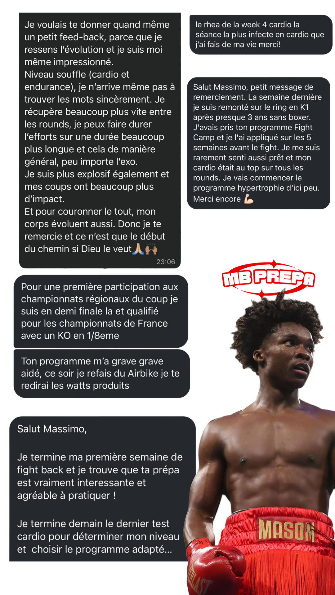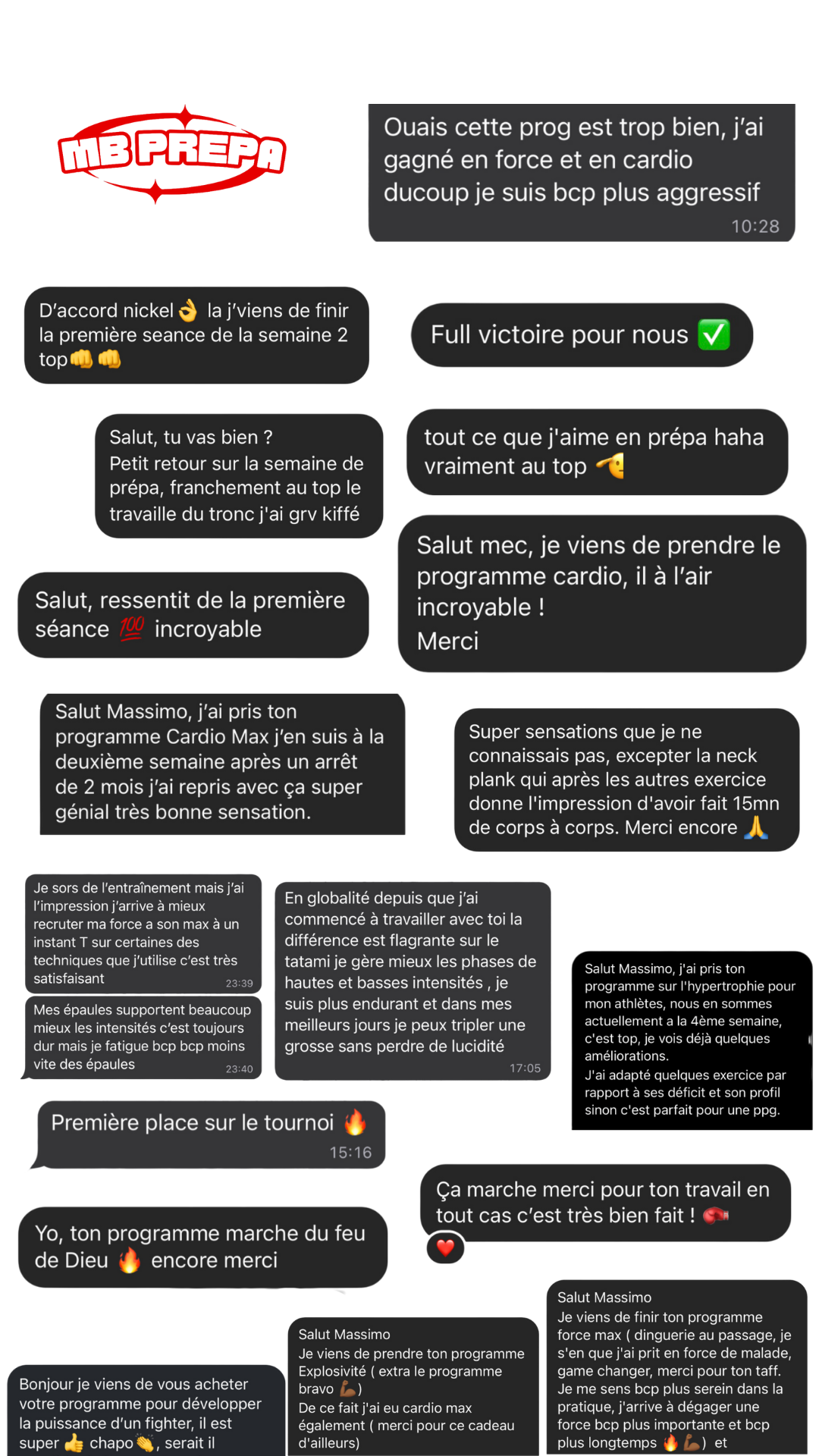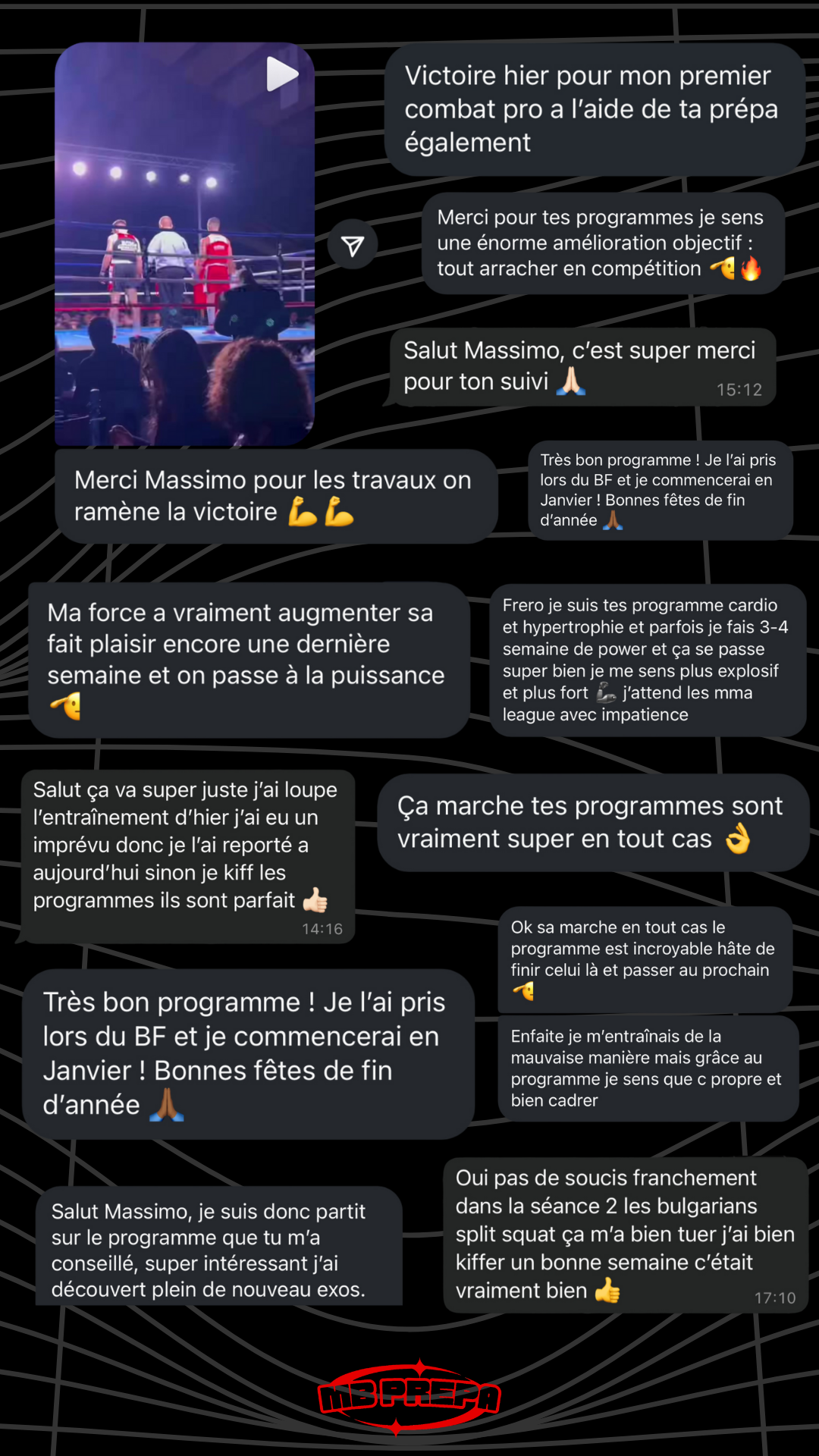 Je me permets de te proposer ce programme car maîtriser sa préparation physique est vraiment quelque chose d'indispensable pour la performance. Avec la méthode que je te propose je suis certain de t'aider à performer, certain de te donner les meilleurs armes pour combattre. À l'heure où j'écris ces lignes, j'ai eu la chance de travailler avec plus de 370 combattants différents, que ce soit à travers mes programmes en ligne ou par le biais d'un suivi en présentiel et personnalisé. J'ai pu faire mes preuves auprès de combattants de tous niveaux, de leur premier combat amateur à des combats en Asie pour remporter des ceintures continentales ou encore remporter le titre de champion de France en boxe anglaise et même signer la performance of the night à l'UFC Paris 2024.