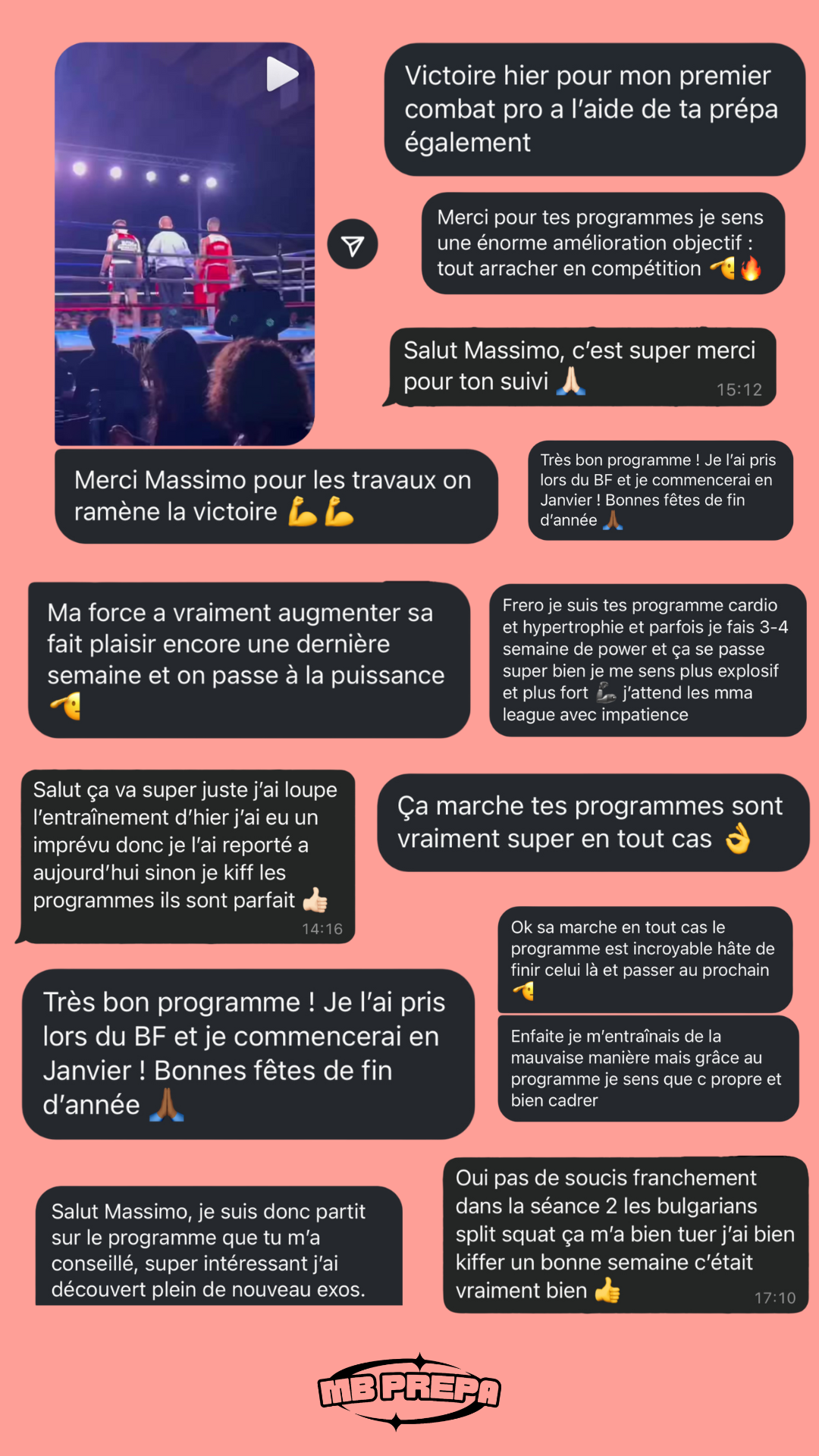 Je me permets de te proposer ce programme car maîtriser sa préparation physique est vraiment quelque chose d'indispensable pour la performance. Avec la méthode que je te propose je suis certain de t'aider à performer, certain de te donner les meilleurs armes pour combattre. À l'heure où j'écris ces lignes, j'ai eu la chance de travailler avec plus de 370 combattants différents, que ce soit à travers mes programmes en ligne ou par le biais d'un suivi en présentiel et personnalisé. J'ai pu faire mes preuves auprès de combattants de tous niveaux, de leur premier combat amateur à des combats en Asie pour remporter des ceintures continentales ou encore remporter le titre de champion de France en boxe anglaise et même signer la performance of the night à l'UFC Paris 2024.