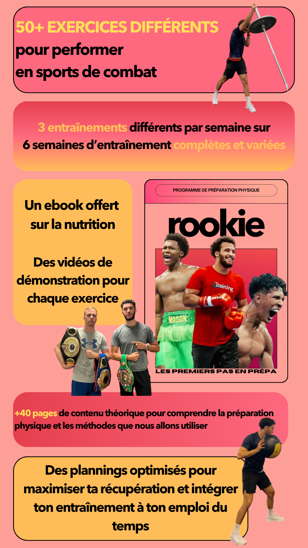 Tu veux devenir plus fort, plus rapide et prêt à affronter n'importe quel adversaire ? Le programme Rookie a été conçu spécialement pour les débutants en préparation physique (ou intermédiaire) souhaitant poser des bases solides en préparation physique, tout en évitant les erreurs classiques.
