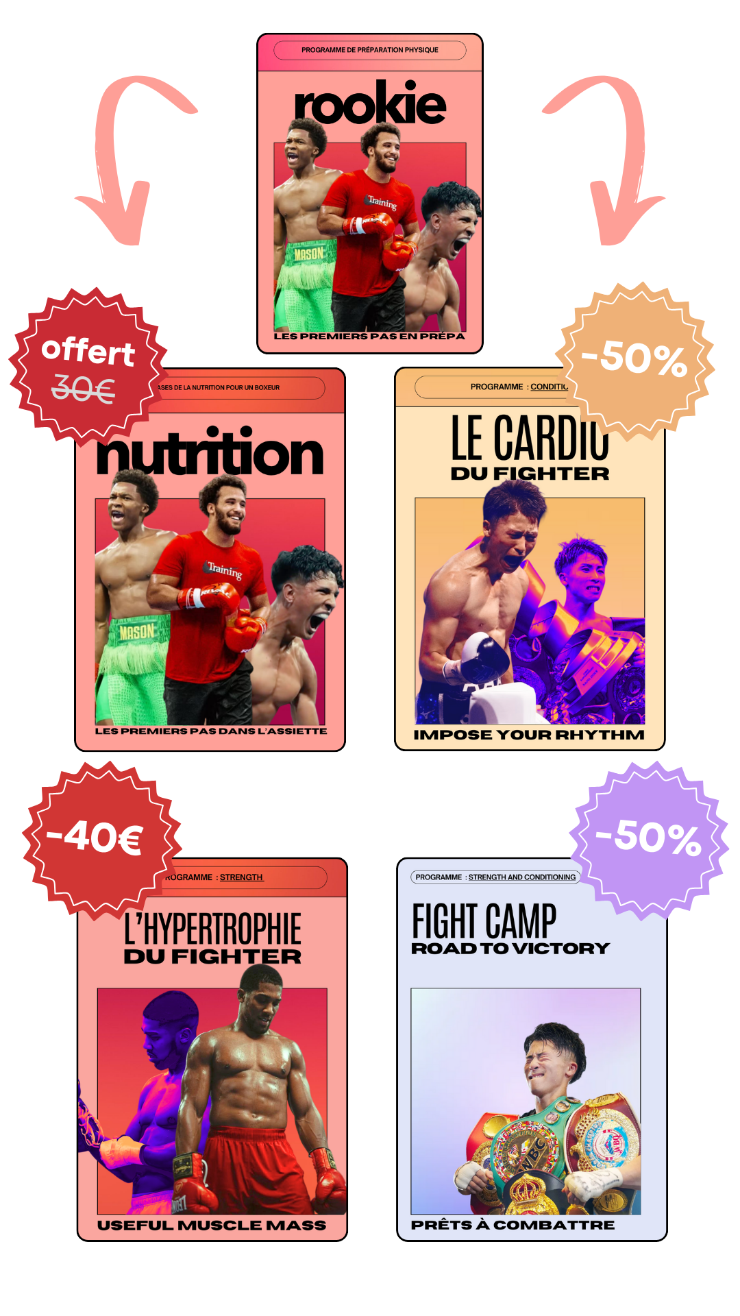 Des bonus exclusifs comme un guide complet sur la nutrition du boxeur et plusieurs réductions exclusives sur d'autre programmes pour poursuivre ta préparation physique.
