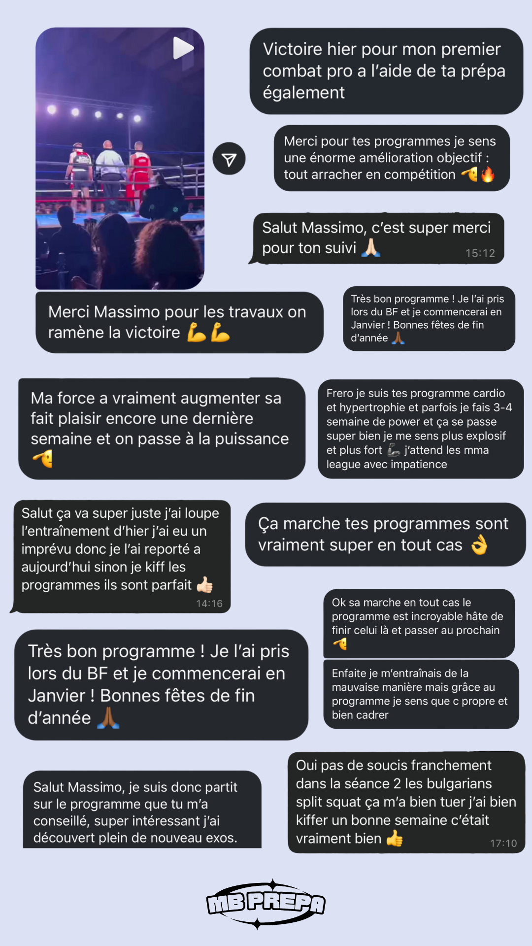 Je me permets de te proposer ce programme car maîtriser sa préparation physique est vraiment quelque chose d'indispensable pour la performance. Avec la méthode que je te propose je suis certain de t'aider à performer, certain de te donner les meilleurs armes pour combattre. À l'heure où j'écris ces lignes, j'ai eu la chance de travailler avec plus de 370 combattants différents, que ce soit à travers mes programmes en ligne ou par le biais d'un suivi en présentiel et personnalisé. J'ai pu faire mes preuves auprès de combattants de tous niveaux, de leur premier combat amateur à des combats en Asie pour remporter des ceintures continentales ou encore remporter le titre de champion de France en boxe anglaise et même signer la performance of the night à l'UFC Paris 2024.